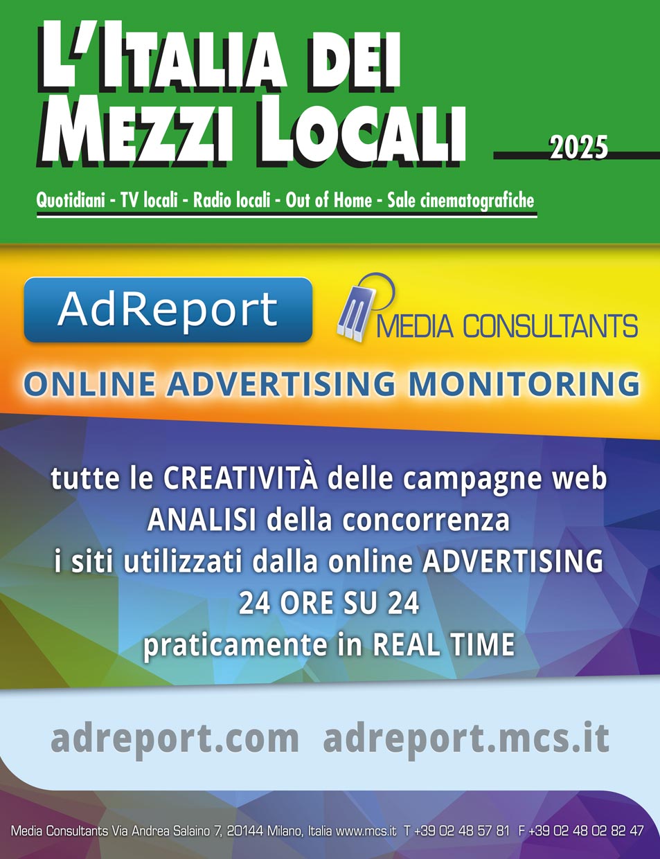 L’Italia è stata suddivisa in 11 macroregioni delle quali vengono esaminati sino a livello di singola provincia: quotidiani locali o edizioni locali di quotidiani nazionali, i più importanti periodici locali, Tv e radio locali, tipologie e impianti dell’Out of Home, sale cinematografiche.